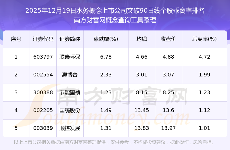 2025年12月19日水務(wù)概念上市公司突破90日線個(gè)股乖離率排名