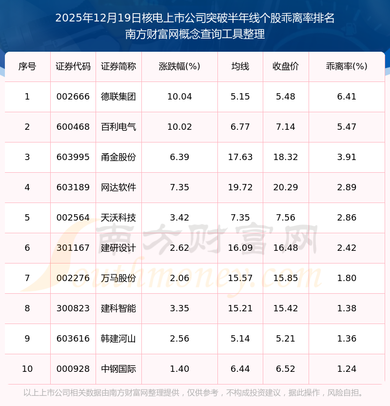 2025年12月19日核電上市公司突破半年線個股乖離率排名