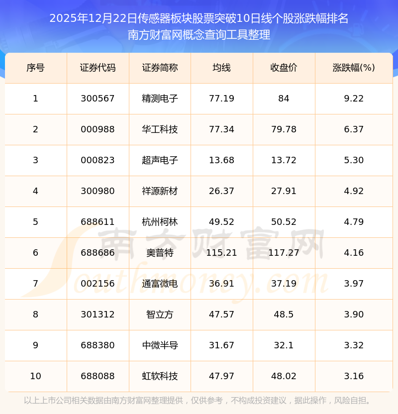 2025年12月22日傳感器板塊股票突破10日線個股漲跌幅排名