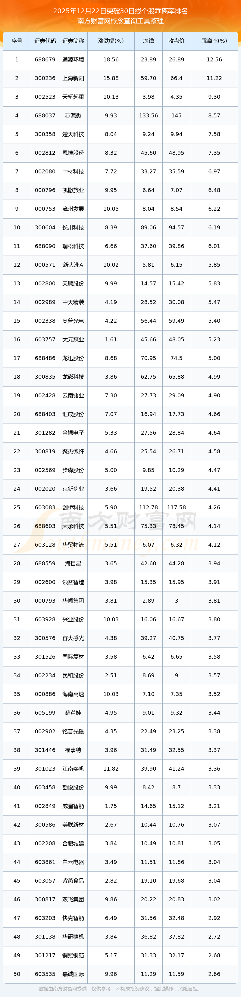 根據(jù)南方財富網(wǎng)概念查詢工具數(shù)據(jù)統(tǒng)計,截止2025年12月22日收盤,共有204只個股收盤價向上突破了30日線,其中乖離率較大的個股有通源環(huán)境、上海新陽、天橋起重、芯源微、楚天科技等,乖離率分別為12.56%、11.22%、9.30%、8.57%、7.58%。