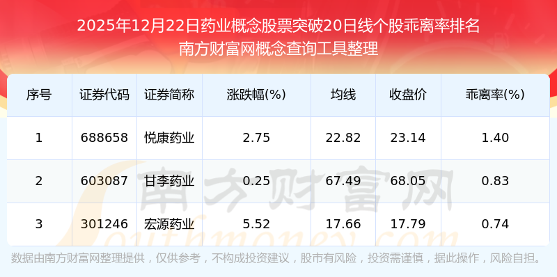 2025年12月22日藥業(yè)概念股票突破20日線個股乖離率排名