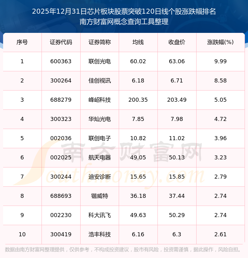 根據(jù)南方財(cái)富網(wǎng)概念查詢工具數(shù)據(jù)統(tǒng)計(jì),截止2025年12月31日收盤,芯片板塊股票共有27只個(gè)股收盤價(jià)向上突破了120日線。其中漲幅較大的個(gè)股有聯(lián)創(chuàng)光電、佳創(chuàng)視訊、峰岹科技等,漲幅分別為9.99%、8.58%、5.05%。