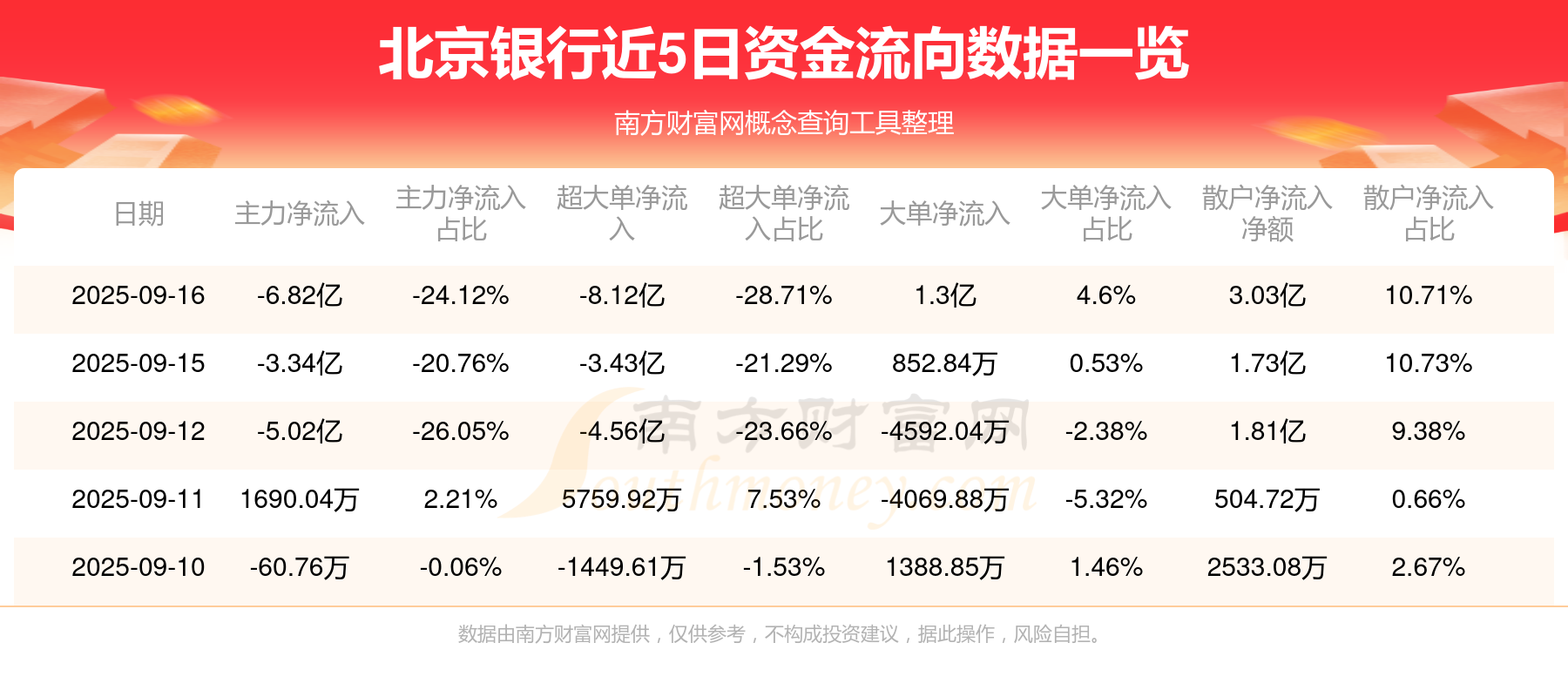 9月16日消息,北京銀行主力資金凈流出6.82億元,超大單資金凈流出8.12億元,散戶資金凈流入3.03億元。