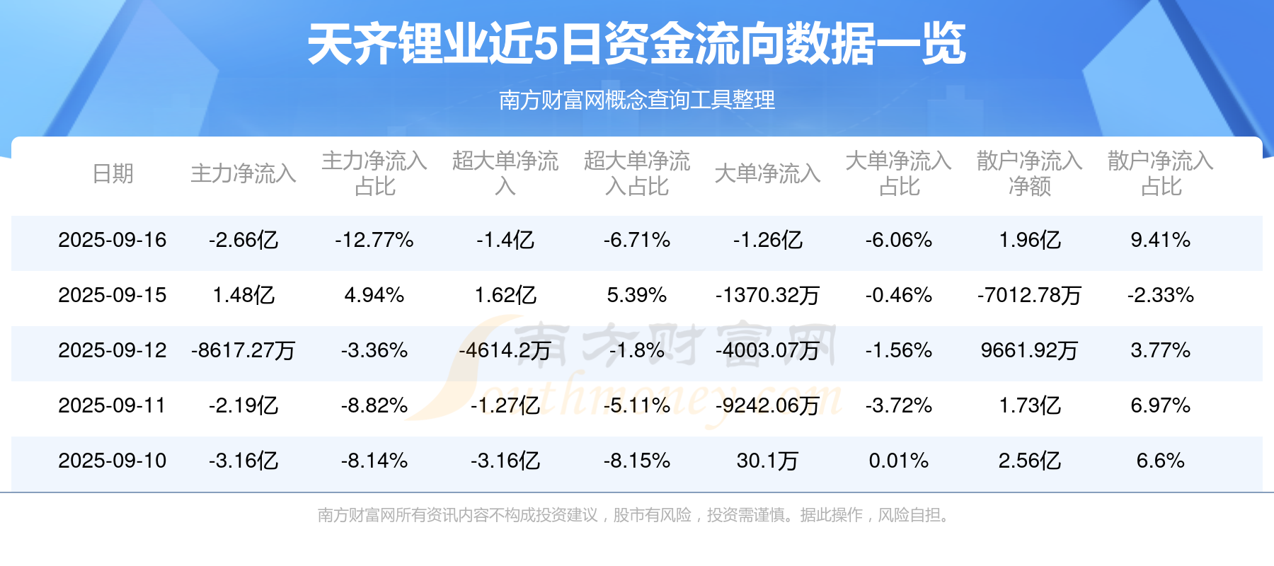 9月16日消息,天齊鋰業(yè)主力凈流出2.66億元,超大單凈流出1.4億元,散戶凈流入1.96億元。