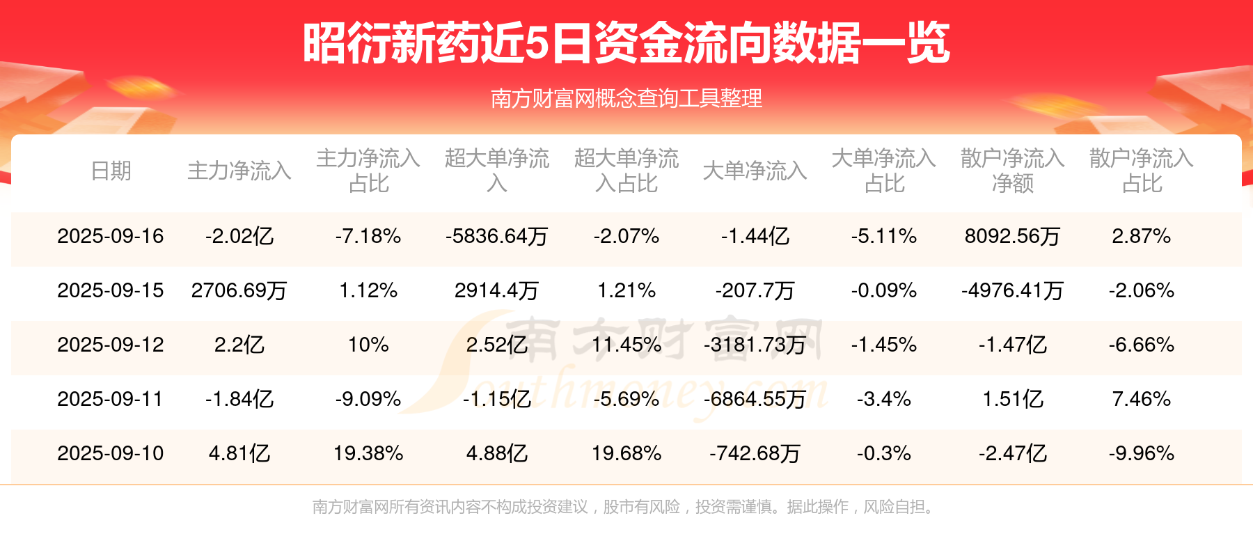 9月16日消息,昭衍新藥主力凈流出2.02億元,超大單凈流出5836.64萬元,散戶凈流入8092.56萬元。