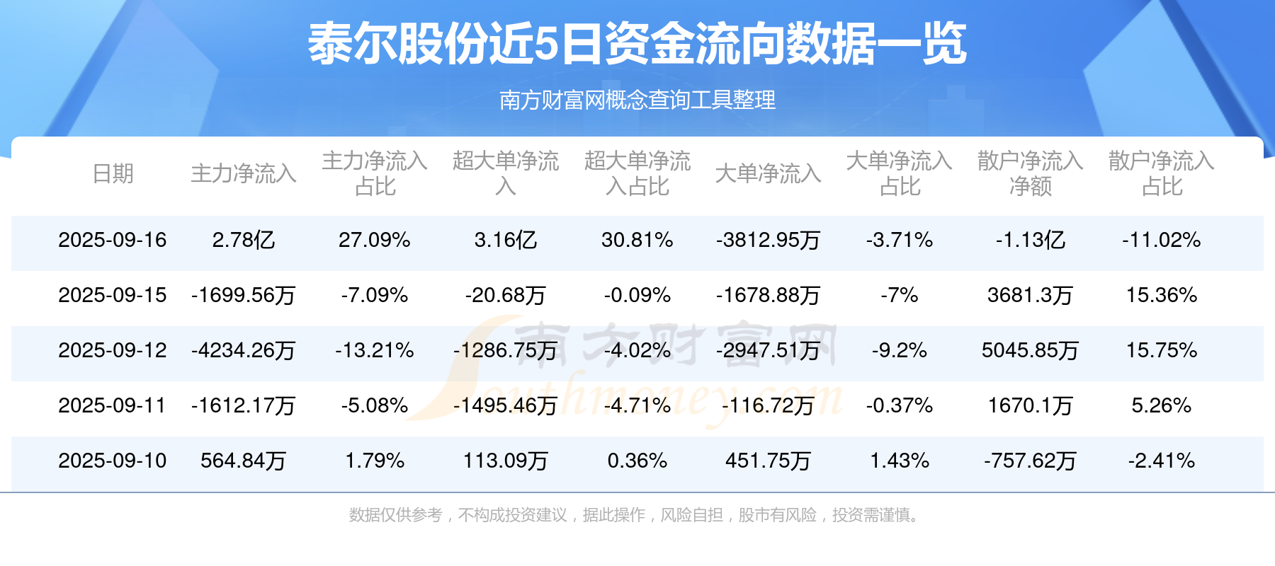 9月16日消息,泰爾股份9月16日主力資金凈流入2.78億元,超大單資金凈流入3.16億元,大單資金凈流出3812.95萬元,散戶資金凈流出1.13億元。