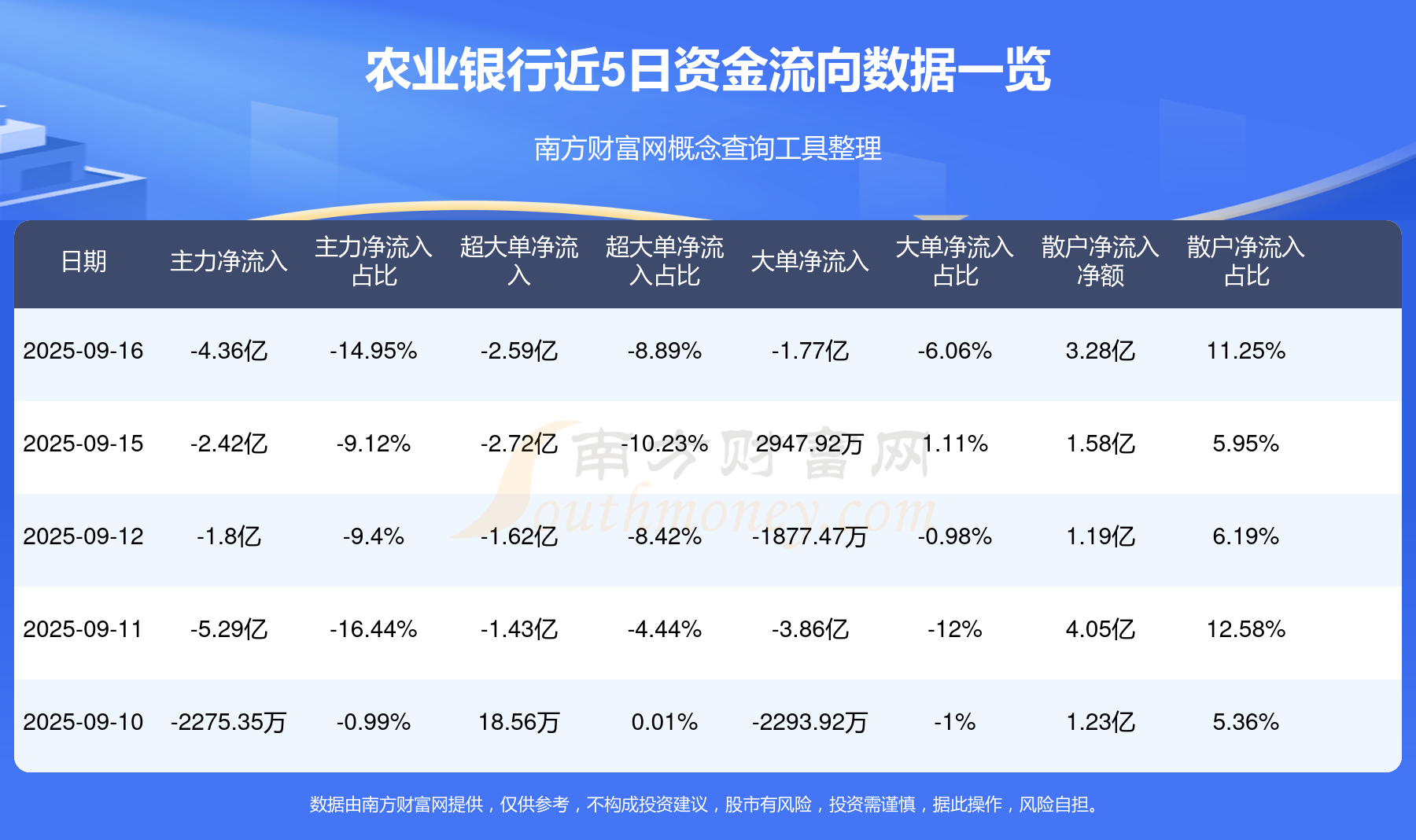 9月16日消息,農(nóng)業(yè)銀行9月16日主力凈流出4.36億元,超大單凈流出2.59億元,大單凈流出1.77億元,散戶凈流入3.28億元。