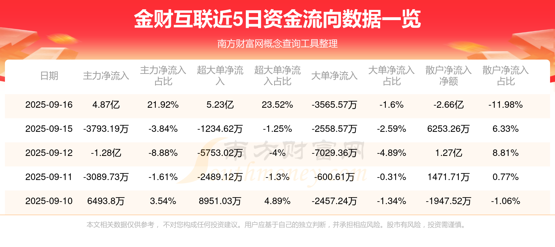 9月16日消息,金財(cái)互聯(lián)9月16日主力凈流入4.87億元,超大單凈流入5.23億元,大單凈流出3565.57萬元,散戶凈流出2.66億元。