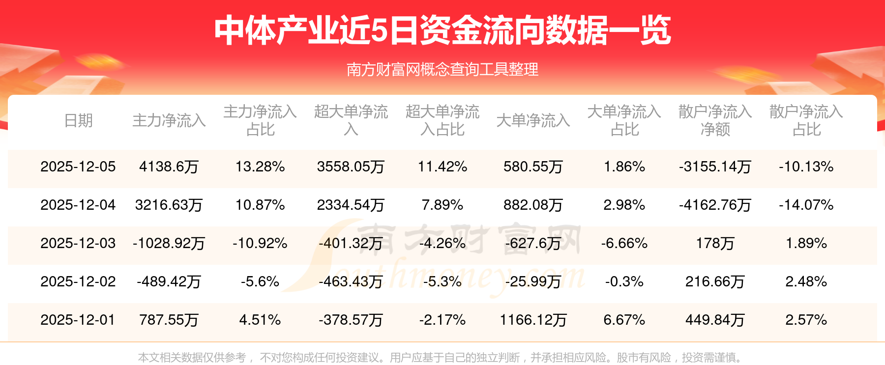 12月5日消息,中體產(chǎn)業(yè)主力資金凈流入4138.6萬元,超大單資金凈流入3558.05萬元,散戶資金凈流出3155.14萬元。