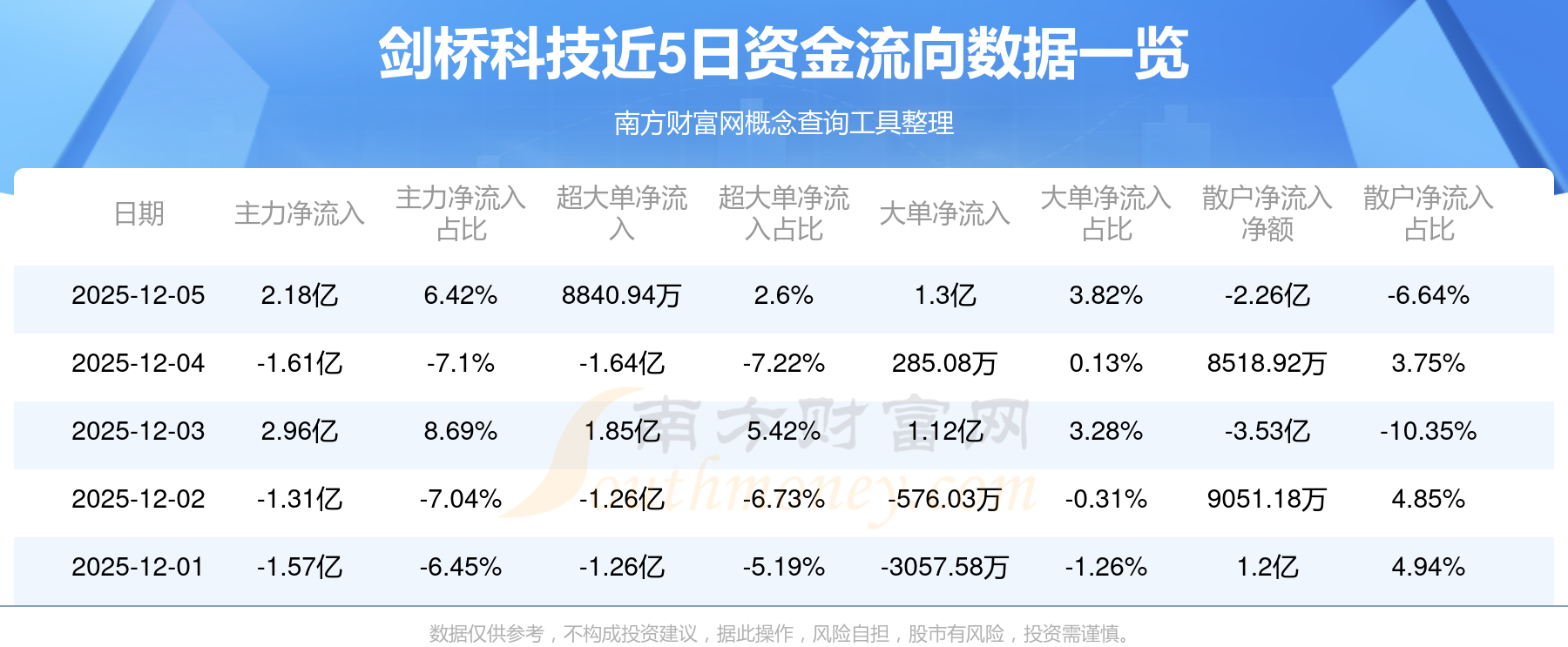 12月5日消息,劍橋科技12月5日主力資金凈流入2.18億元,超大單資金凈流入8840.94萬元,大單資金凈流入1.3億元,散戶資金凈流出2.26億元。