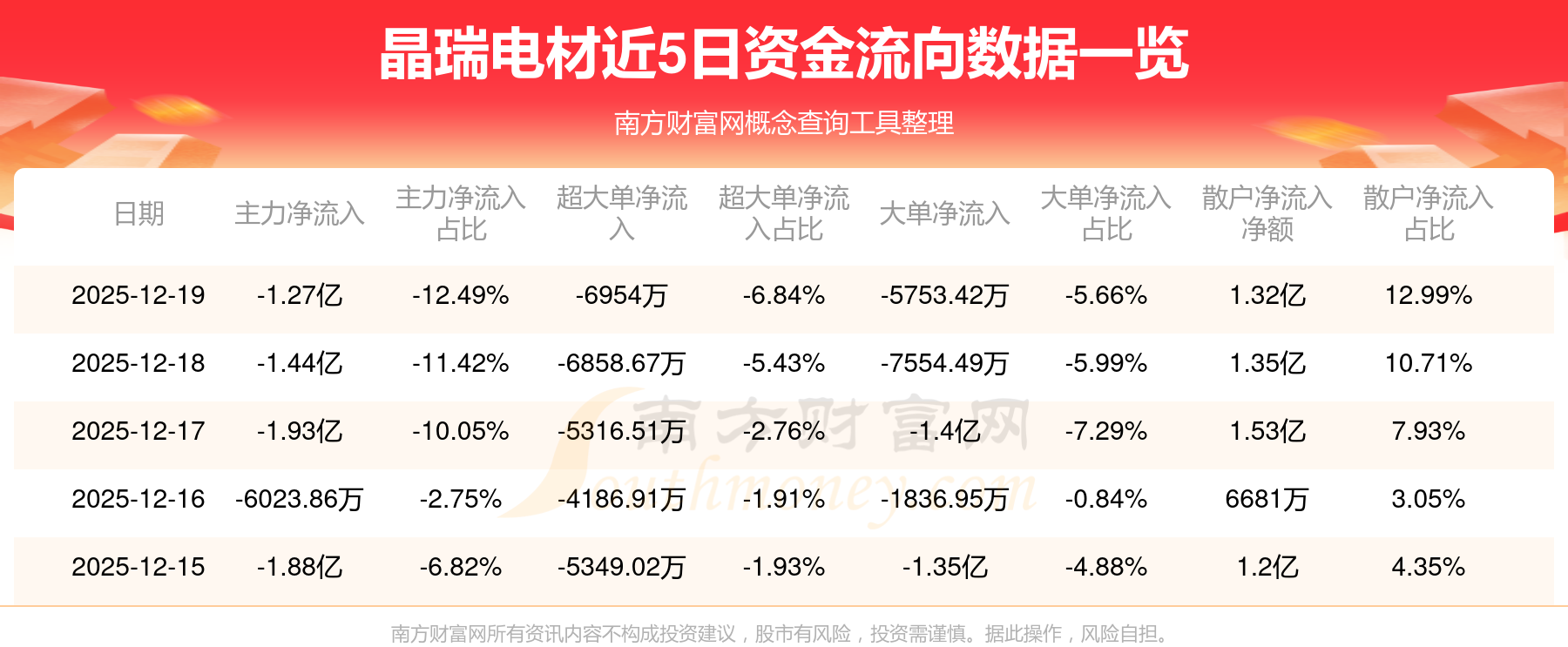 資金流向數(shù)據(jù)方面,12月19日主力資金凈流流出1.27億元,超大單資金凈流出6954萬(wàn)元,大單資金凈流出5753.42萬(wàn)元,散戶資金凈流入1.32億元。