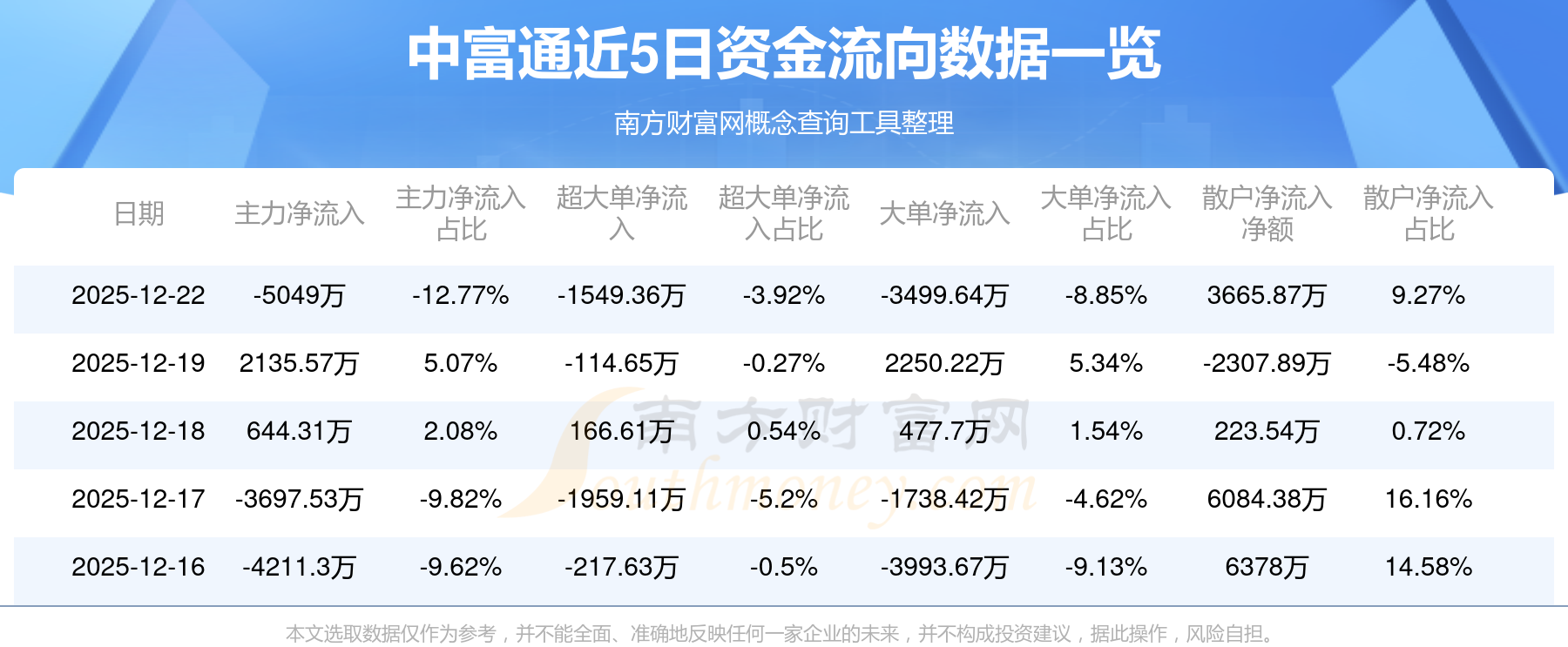 12月22日消息,中富通主力資金凈流出5049萬(wàn)元,超大單資金凈流出1549.36萬(wàn)元,散戶資金凈流入3665.87萬(wàn)元。