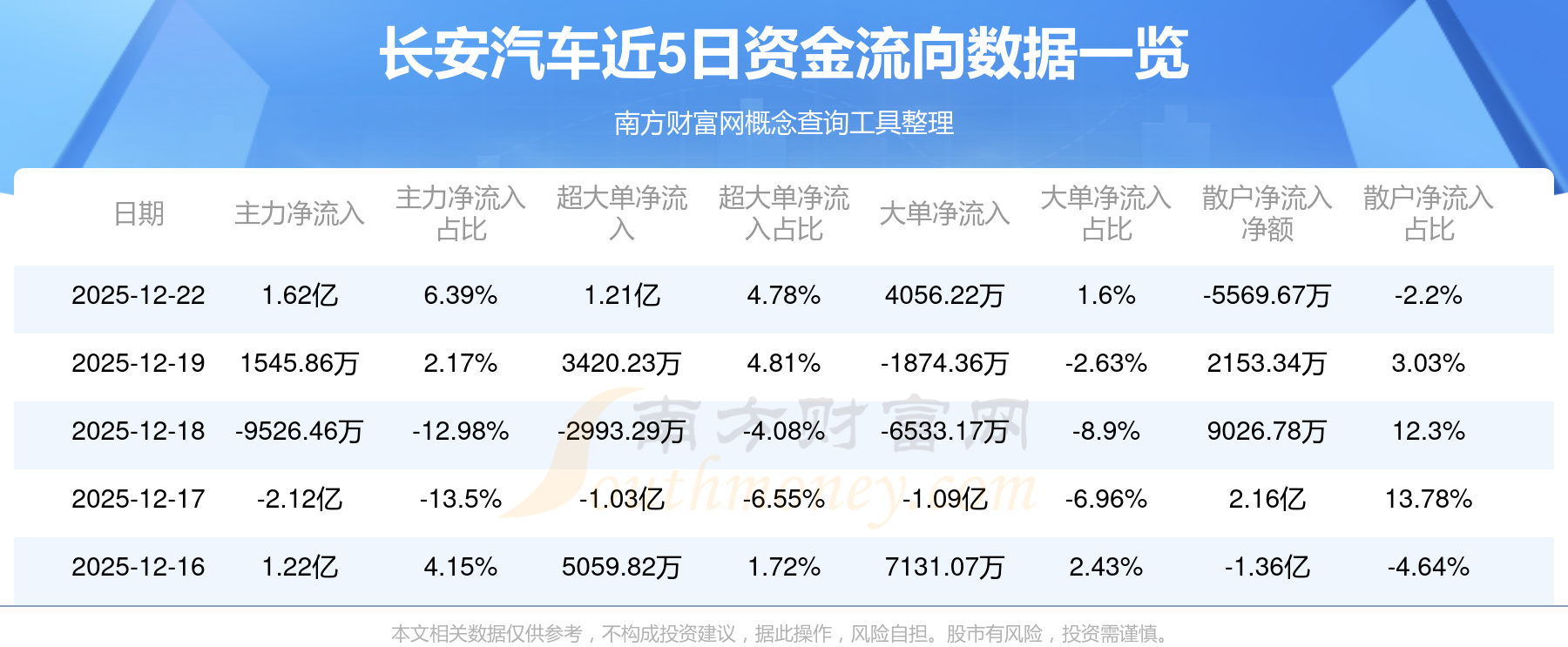 12月22日消息,長安汽車資金凈流入1.62億元,超大單資金凈流入1.21億元,換手率2.08%,成交金額20.88億元。