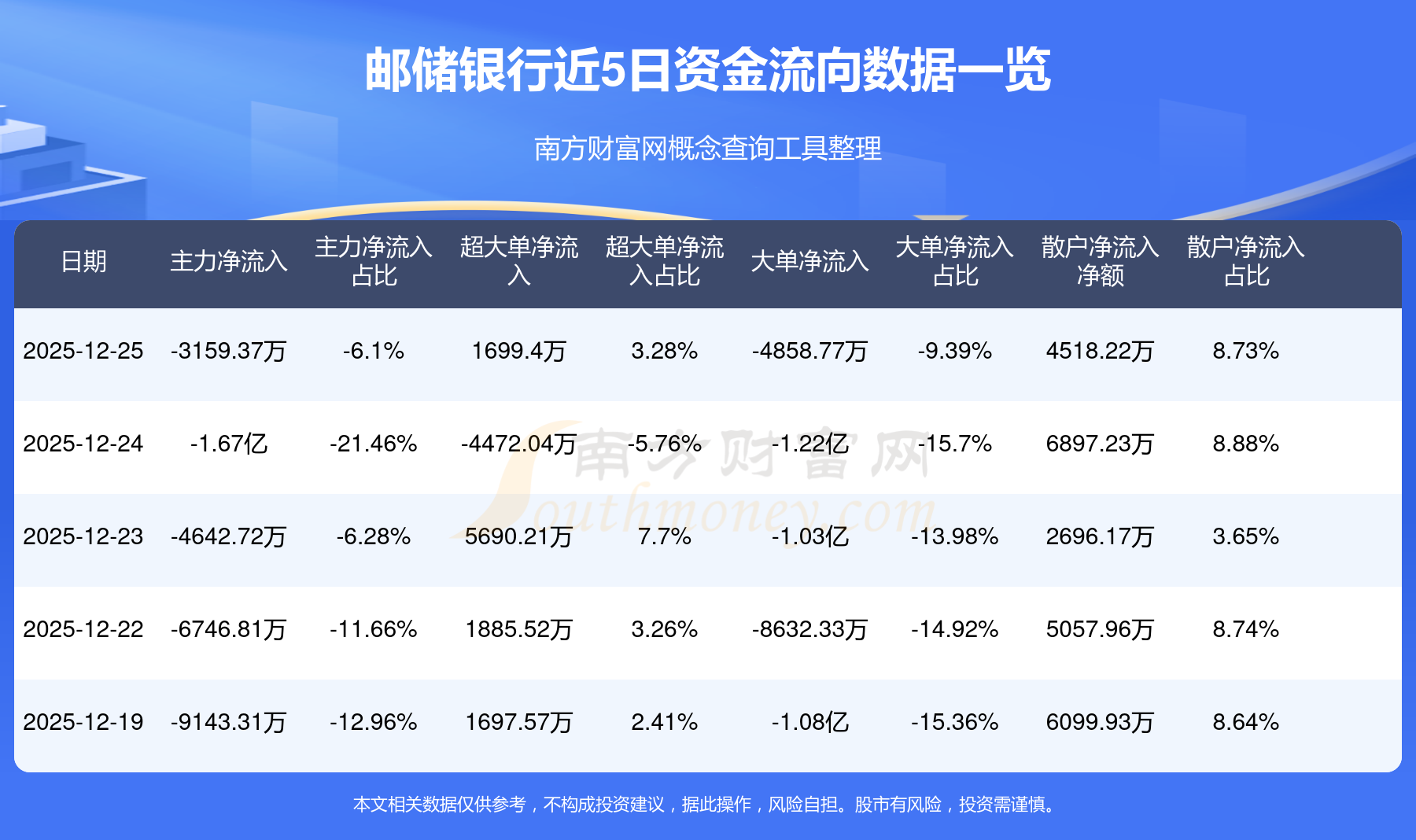 12月25日消息,郵儲銀行資金凈流出3159.37萬元,超大單凈流入1699.4萬元,換手率0.14%,成交金額5.18億元。