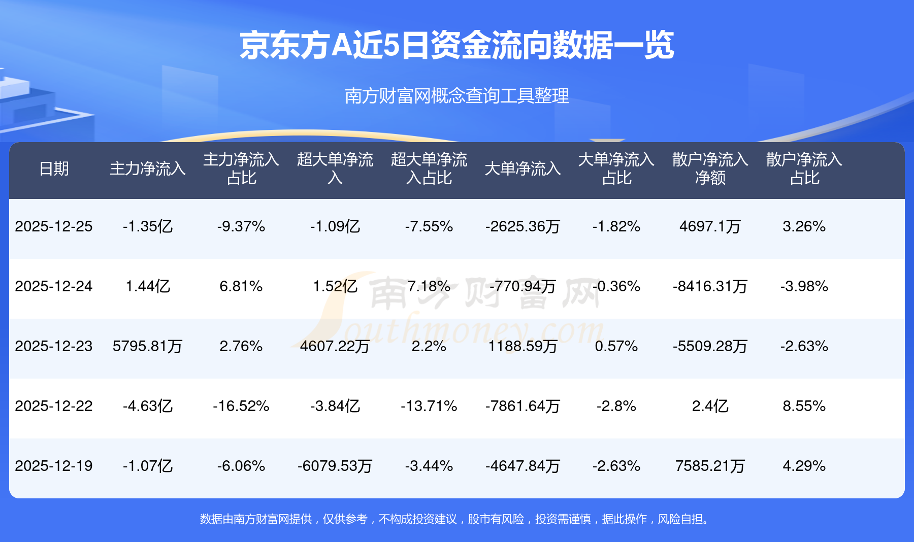 12月25日消息,京東方A12月25日主力凈流出1.35億元,超大單凈流出1.09億元,大單凈流出2625.36萬(wàn)元,散戶凈流入4697.1萬(wàn)元。