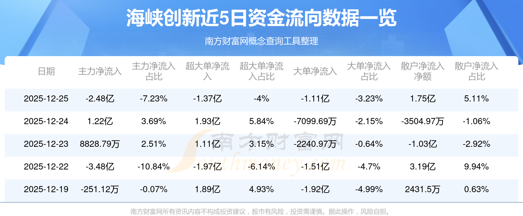 12月25日消息,海峽創(chuàng)新12月25日主力凈流出2.48億元,超大單凈流出1.37億元,大單凈流出1.11億元,散戶凈流入1.75億元。