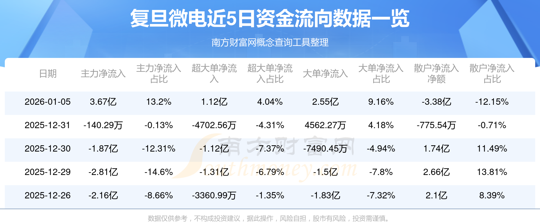 1月5日消息,復(fù)旦微電資金凈流入3.67億元,超大單資金凈流入1.12億元,換手率6.64%,成交金額27.78億元。