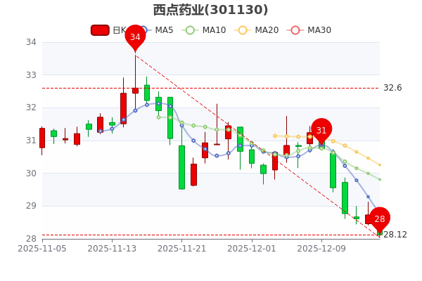 12月16日消息,西點藥業(yè)5日內(nèi)股價下跌9.35%,最新報28.120元,成交量72.58萬手,總市值為21.51億元。