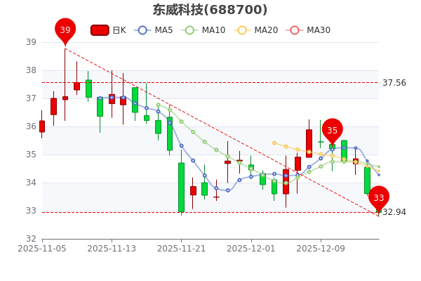 截止12月16日15時,東威科技(688700)跌1.99%,股價為32.940元,盤中股價最高觸及33.82元,最低達(dá)32.8元,總市值98.29億元。