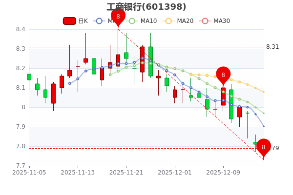 12月16日收盤消息,工商銀行(601398)股價(jià)報(bào)7.790元/股,跌0.26%。7日內(nèi)股價(jià)下跌2.57%,今年來漲幅上漲11.17%,成交總金額15.05億元,成交量1.93億手。