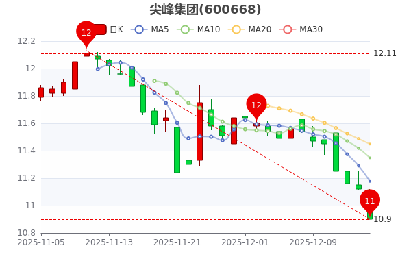 12月16日消息,尖峰集團(tuán)開(kāi)盤(pán)報(bào)11.1元,截至15時(shí)收盤(pán),該股跌1.98%,報(bào)10.900元。換手率1.01%,振幅跌1.98%。