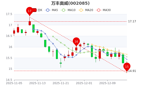 萬豐奧威消息,12月16日該股開盤報(bào)15.28元,截至收盤,股價(jià)報(bào)14.910元跌2.36%,成交量3589.2萬手,換手率1.69%,總市值為316.58億元。