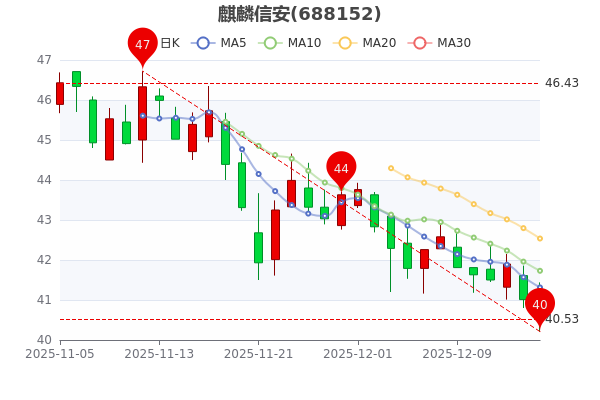 截止12月11日15時(shí),麒麟信安(688152)漲0.65%,股價(jià)為40.530元,盤中股價(jià)最高觸及42.38元,最低達(dá)41.68元,總市值41.68億元。