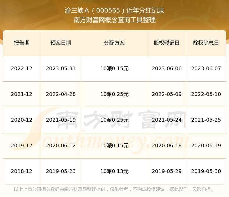 渝三峽A最新一次公布的分紅方案為10派0.15元。本次權(quán)益分派股權(quán)登記日為2023年6月6日,除權(quán)除息日為2023年6月7日,派息日為2023年6月7日。