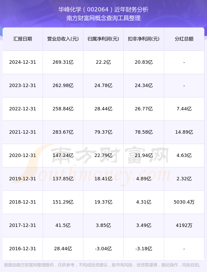 2024年華峰化學(xué)總營(yíng)收269.31億,同比增長(zhǎng)2.41%;凈利潤(rùn)22.2億,同比增長(zhǎng)-10.43%;銷售毛利率13.83%。