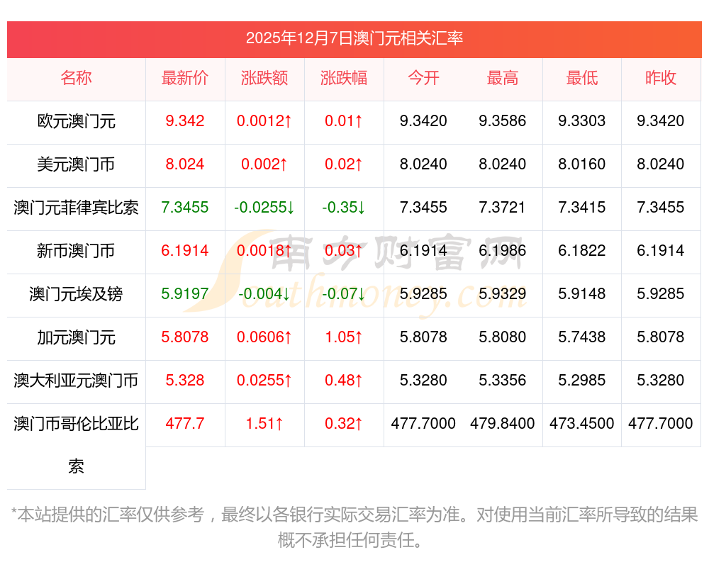 2025年12月7日澳門元相關(guān)匯率查詢