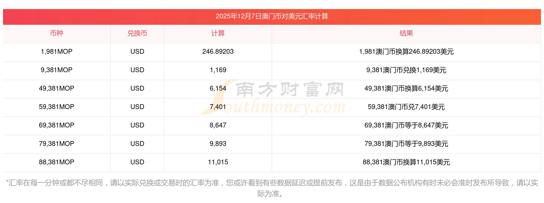 2025年12月7日匯率行情:21澳門幣對美元匯率多少