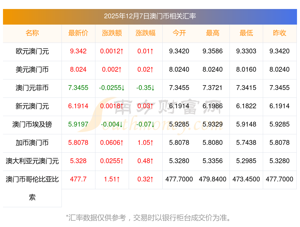 2025年12月7日澳門幣相關(guān)匯率查詢
