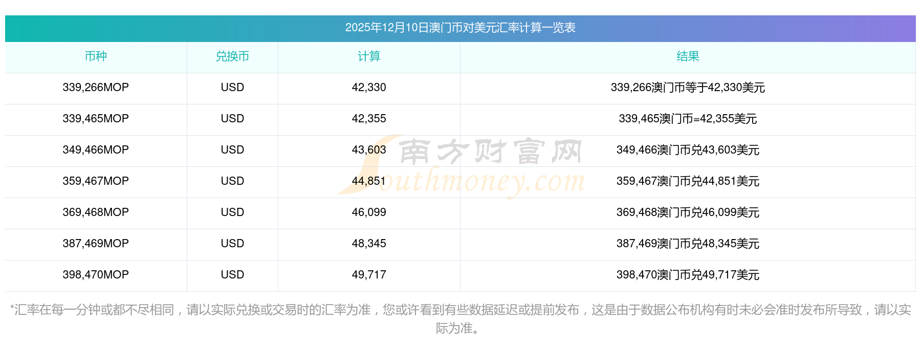 2025年12月10日匯率行情:49澳門幣對美元匯率多少