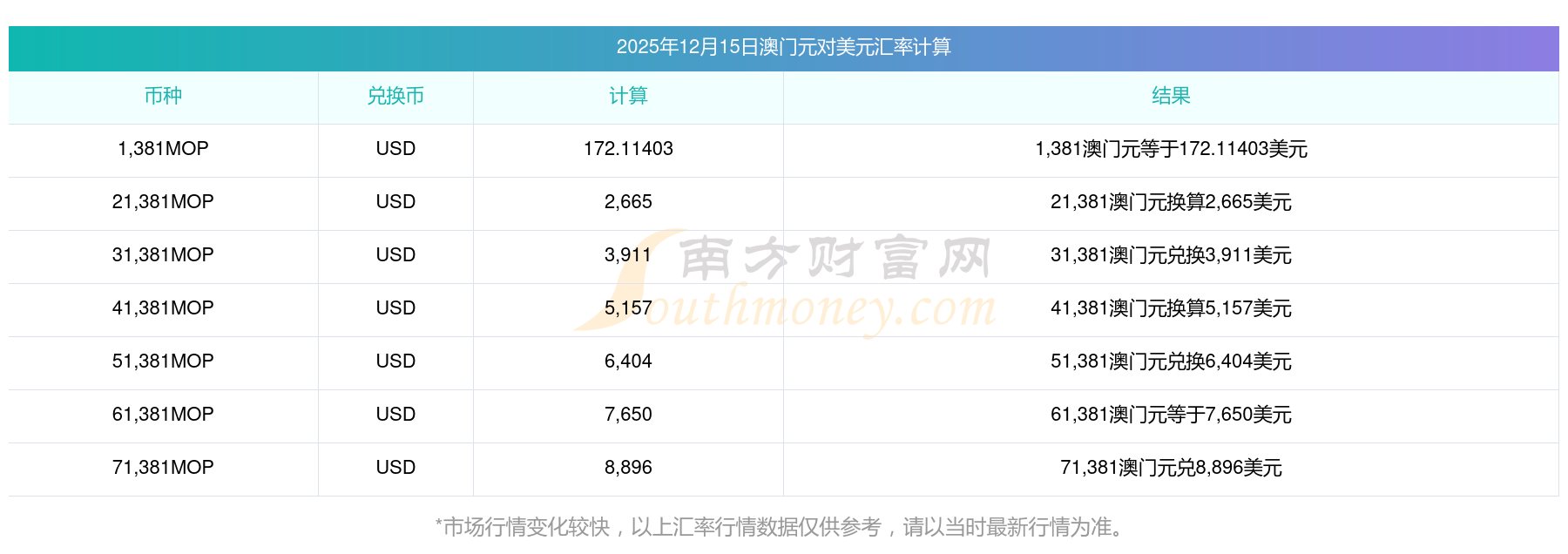 2025年12月15日匯率行情:48澳門元對美元匯率多少