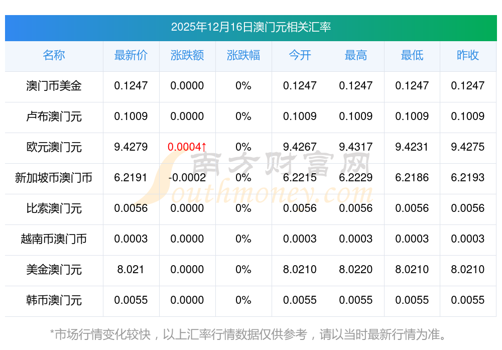 根據(jù)2025年12月16日匯率,澳門元兌換剛郎匯率最新286.320000,今開286.3200,昨收286.3200,最高286.3300,最低286.2800。