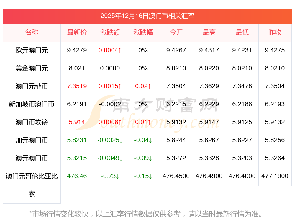 2025年12月16日澳門幣相關(guān)匯率查詢