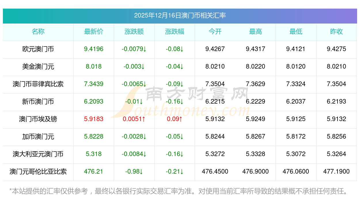 2025年12月16日澳門幣相關(guān)匯率查詢