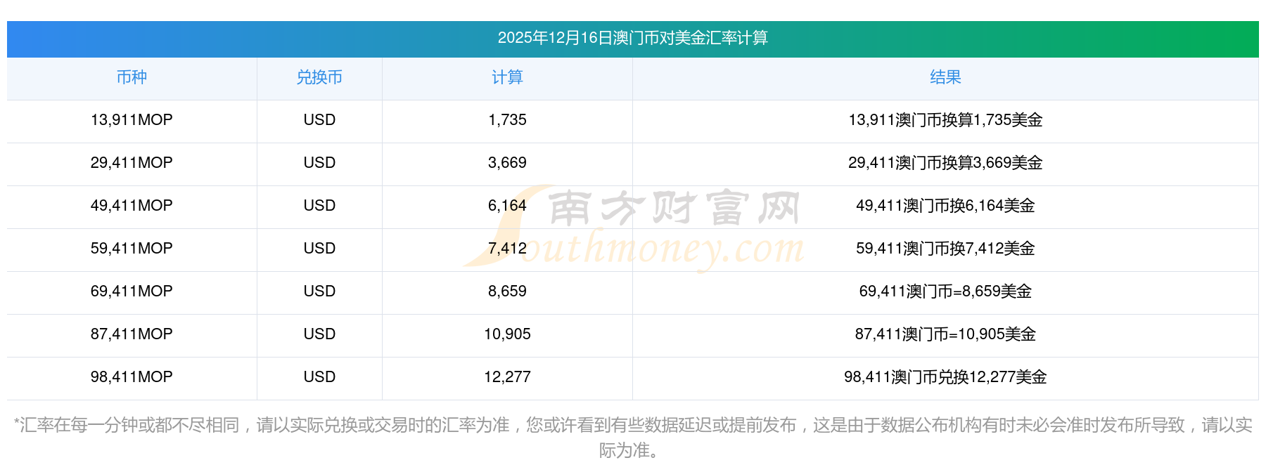 南方財富網(wǎng)為您提供澳門幣對美金匯率最新價格詳情。