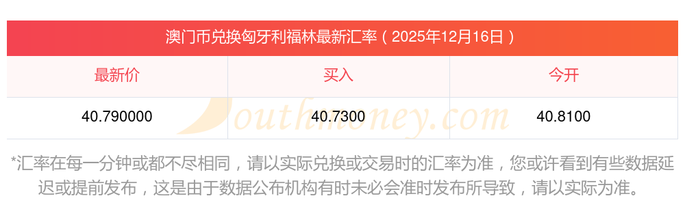 2025年12月16日,貨幣兌換:1澳門幣=40.79匈牙利福林。如:1澳門幣、2澳門幣、5澳門幣、10澳門幣、20澳門幣、50澳門幣、100澳門幣,分別折合匈牙利福林40.79、81.58、203.95、407.9、815.8、2039.5、4079匈牙利福林。