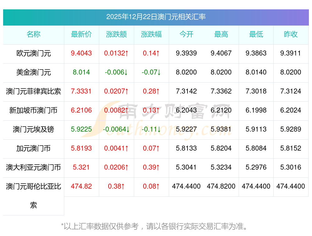 根據(jù)2025年12月22日匯率,澳門元兌換剛郎匯率最新價(jià)282.650000,今開價(jià)282.4200,昨收價(jià)282.4200,最高價(jià)282.6500,最低價(jià)282.4200。