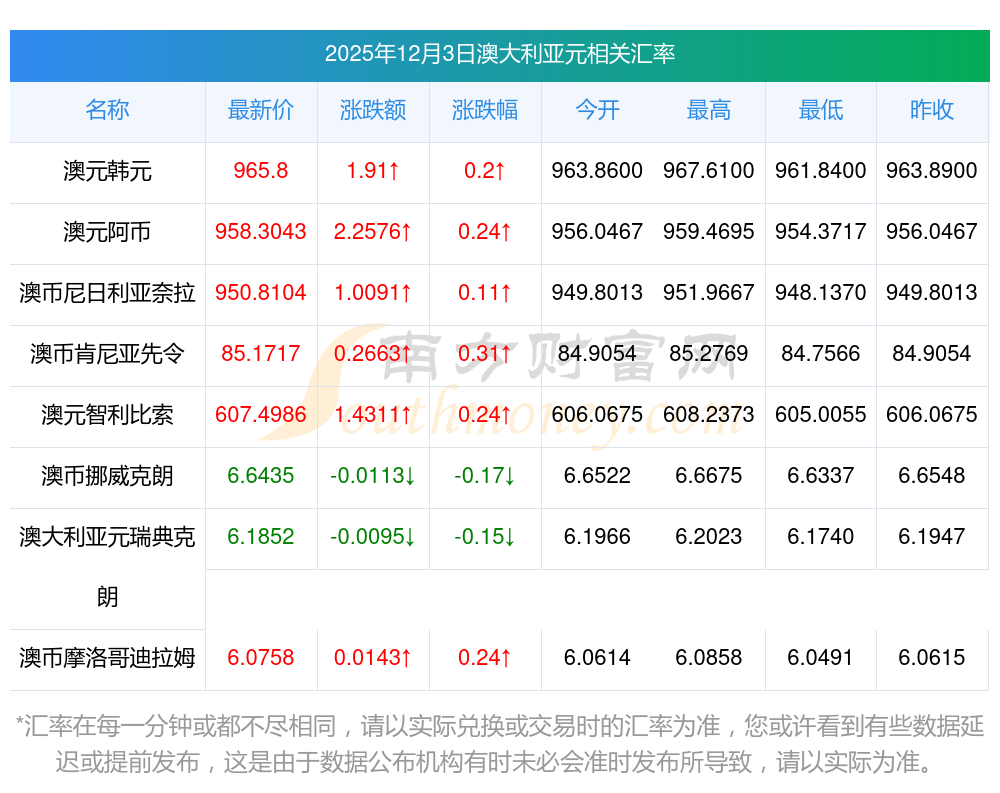 2025年12月3日澳大利亞元相關(guān)匯率查詢