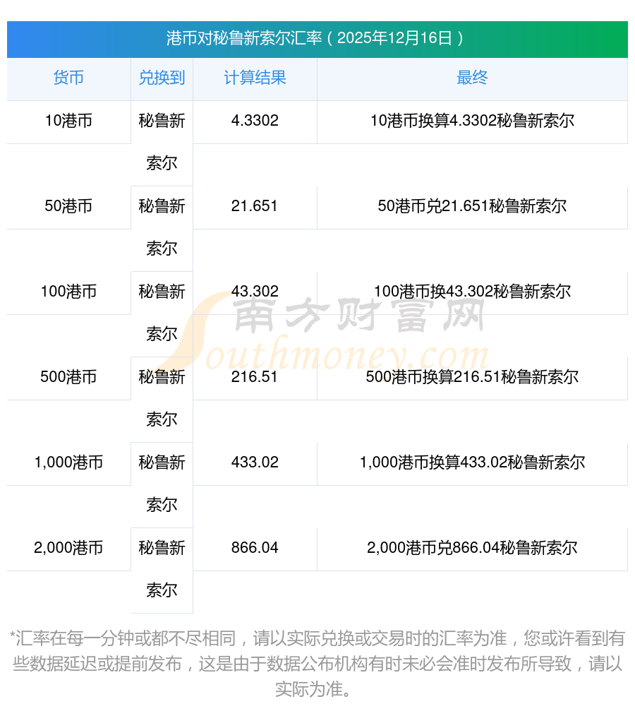 今天港幣秘魯新索爾外匯匯率一覽2025/12/16