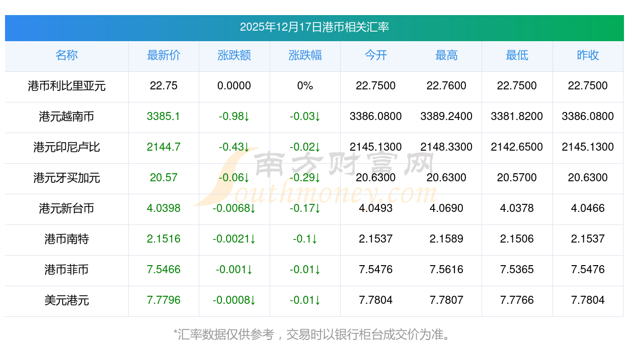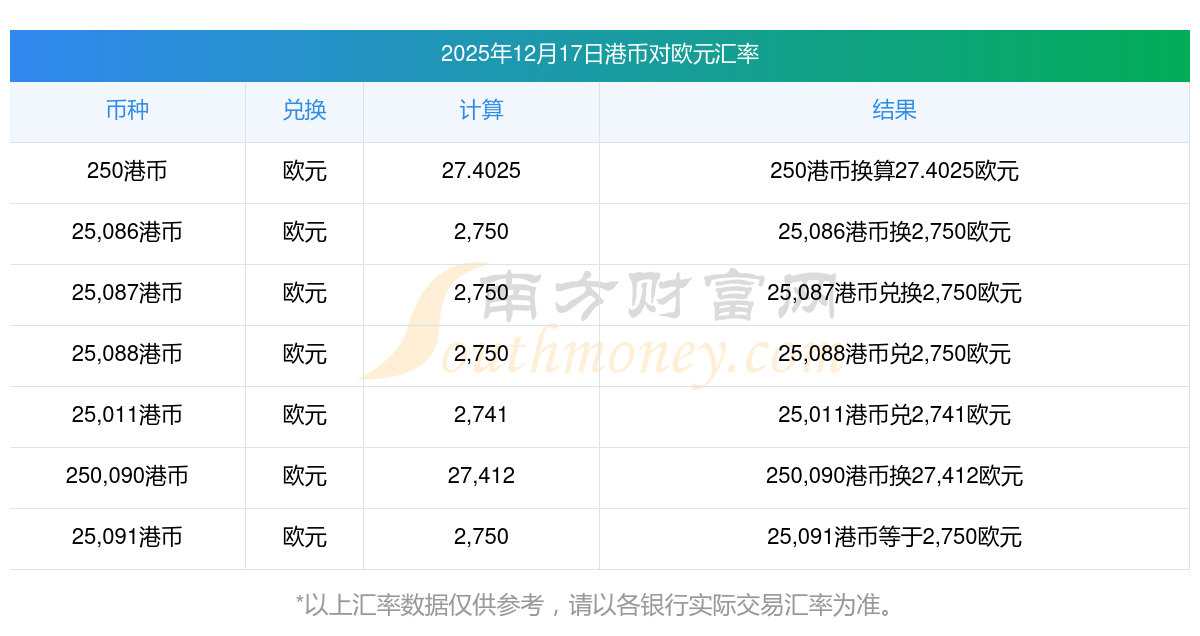 外幣匯率今日港幣換歐元匯率多少? 2025年12月17日