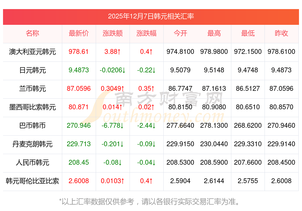 2025年12月7日最新消息,韓元兌換人民幣最新匯率為0.004800,今開(kāi)為0.0048,昨收為0.0048,最高為0.0048,最低為0.0048。