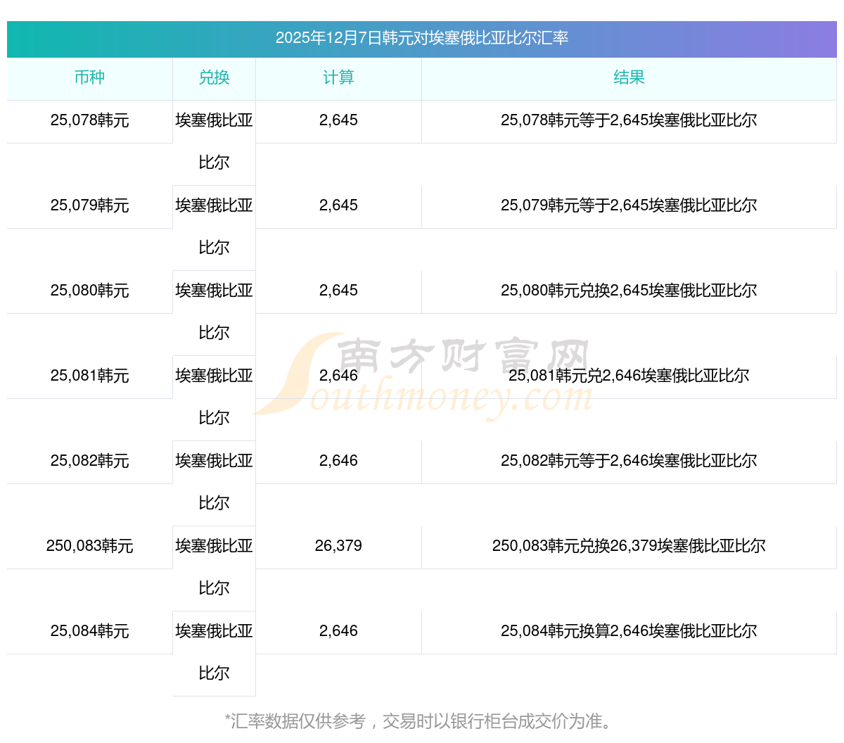 南方財富網(wǎng)為您提供韓元對埃塞俄比亞比爾匯率最新價格詳情。