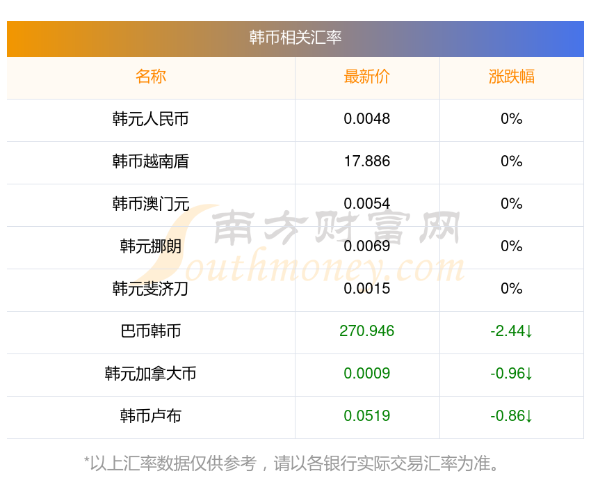 南方財富網(wǎng)為您提供韓幣對剛郎匯率最新價格詳情。