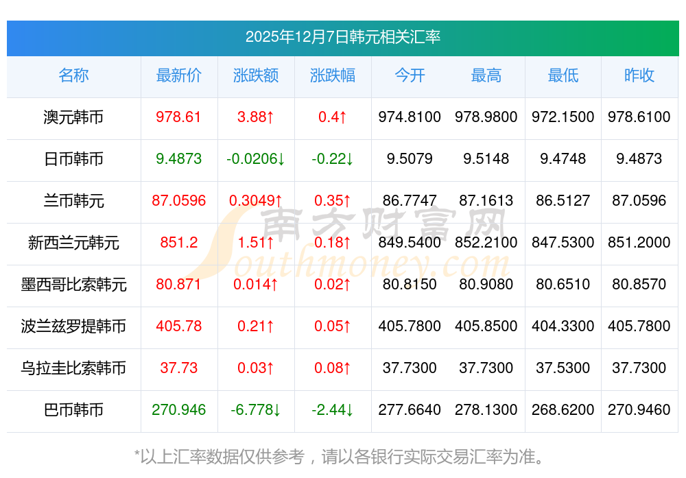 2025年12月7日韓元相關(guān)匯率查詢