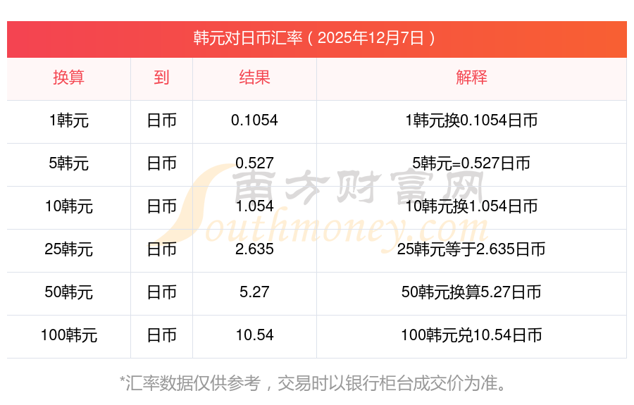 今天韓元兌日元匯率查詢,一韓元兌換多少日元?2025-12-7