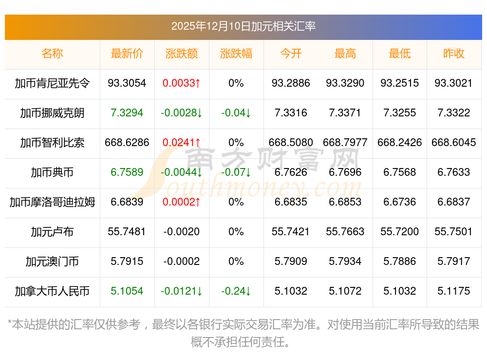 2025年12月10日加元相關(guān)匯率查詢