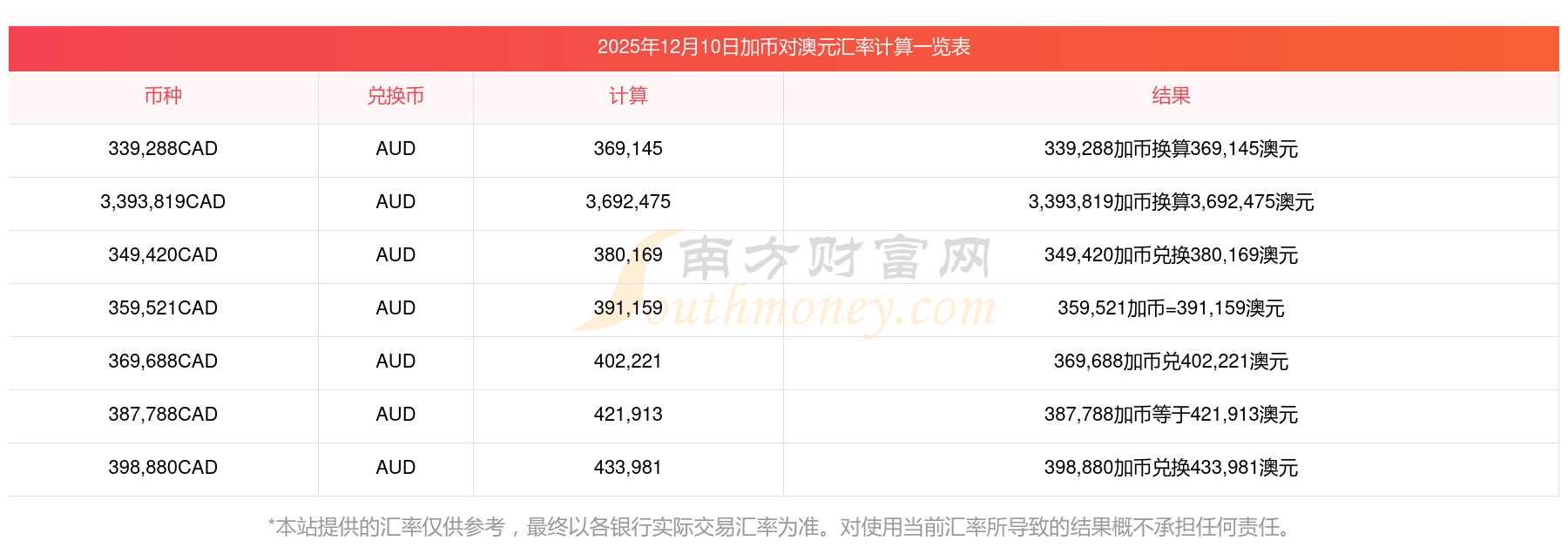 匯率實時更新!95加幣兌換澳元匯率表(2025年12月10日)